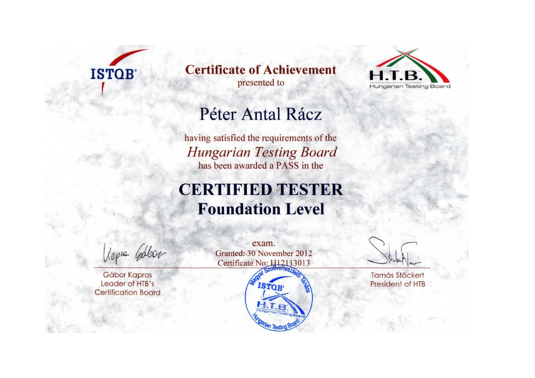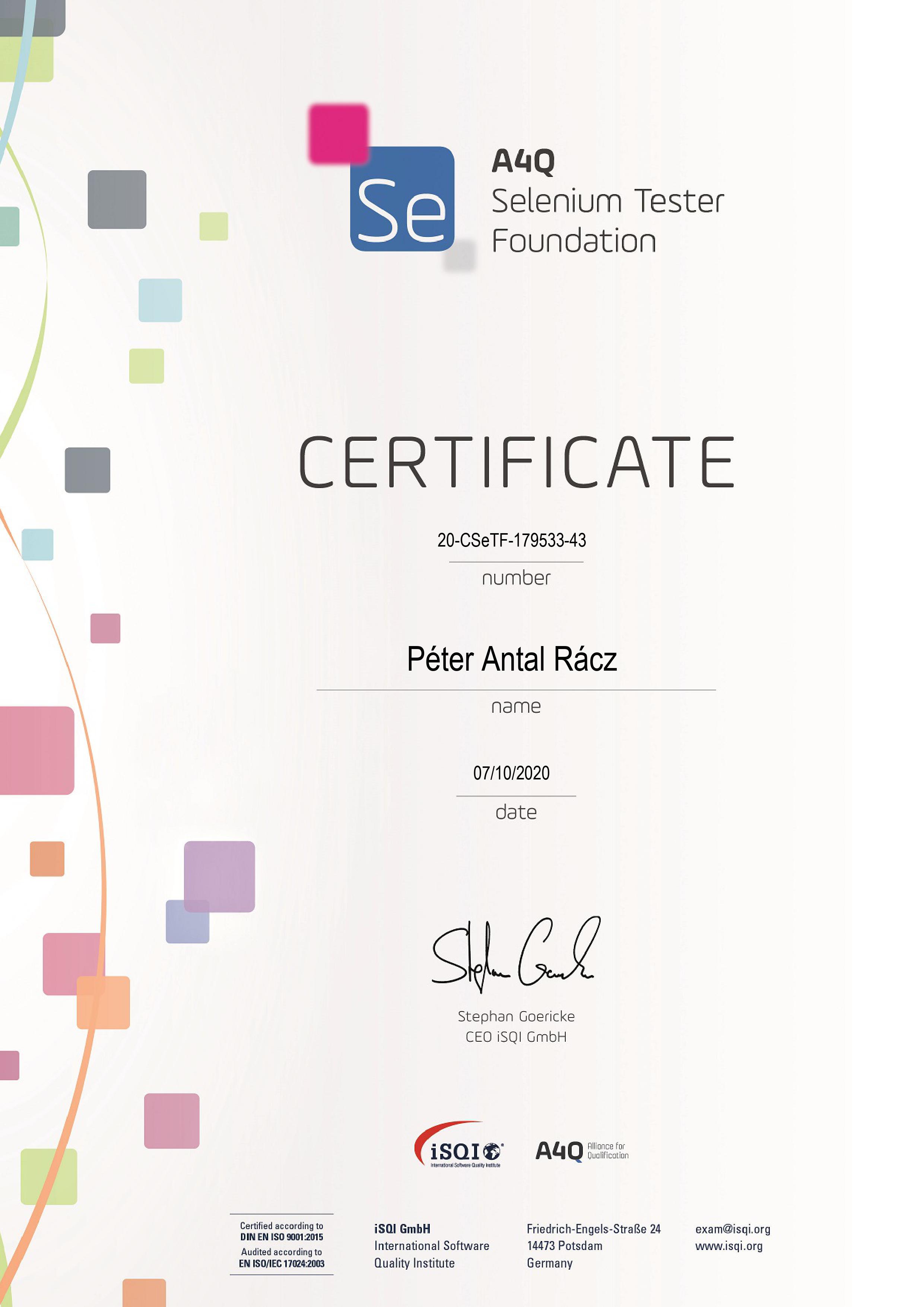 My name is Péter Antal Rácz. I received my degree in programming from the University of Szeged. I work as a test automation architect at Generali. I mainly deal with front-end testing. As a result, I give related trainings. For example, Java, Selenium, RestAssured, Appium, ISTQB, etc.
